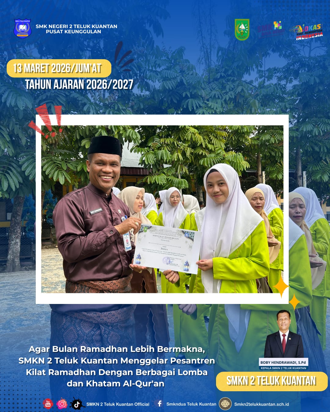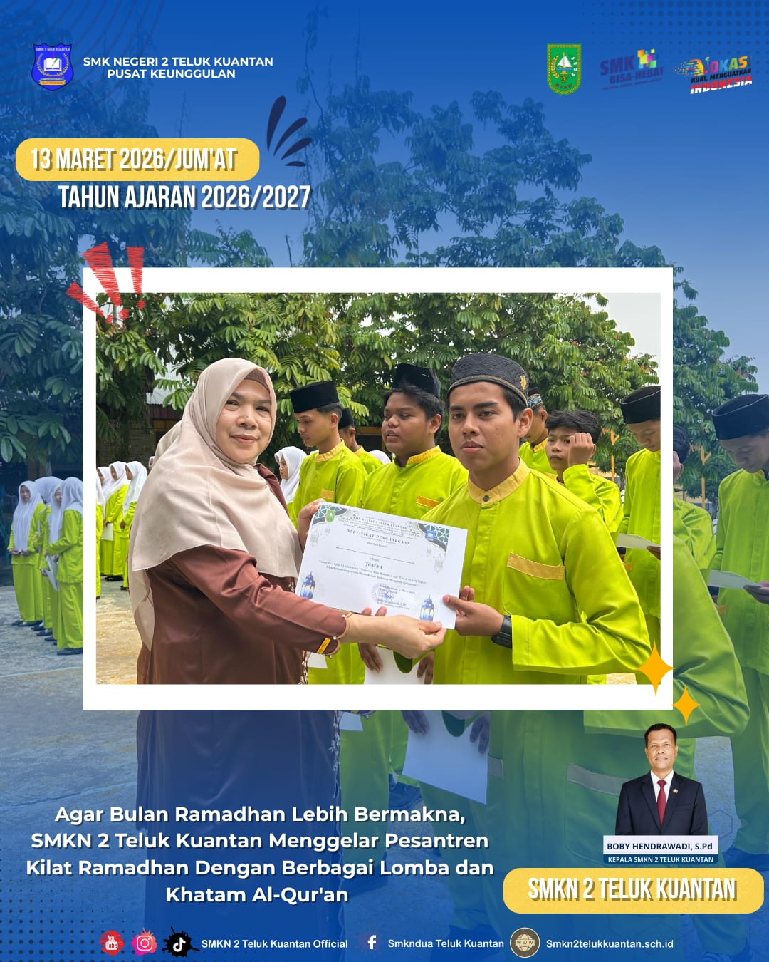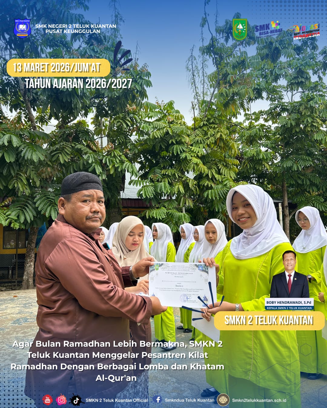 Alhamdulillah, rangkaian kegiatan Pesantren Kilat Ramadhan 1447 H di SMKN 2 Teluk Kuantan telah resmi ditutup pada hari Jum’at, 13 Maret 2026. Kegiatan yang berlangsung selama bulan suci Ramadhan ini menjadi salah satu upaya sekolah dalam meningkatkan keimanan, ketakwaan, serta membentuk karakter religius peserta didik.